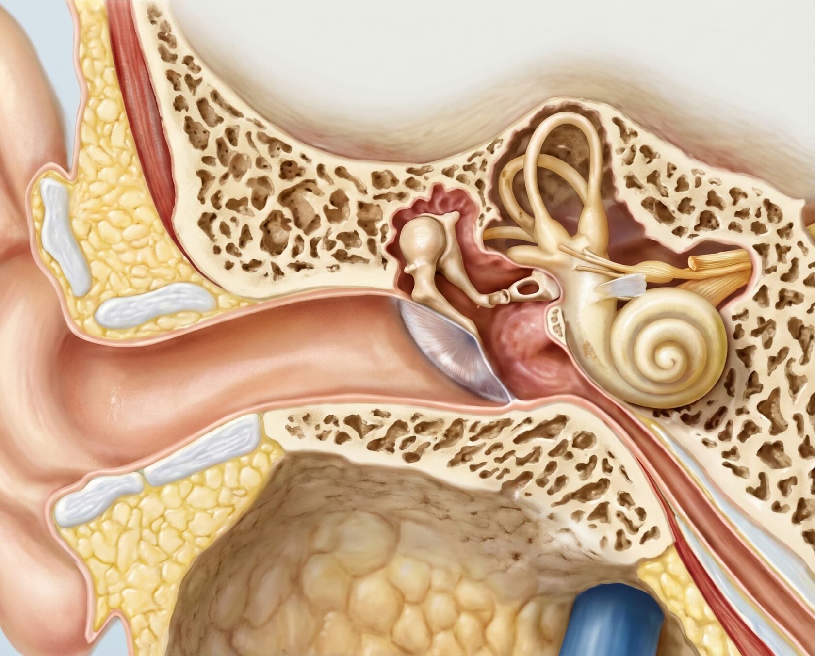 Воздухоносные ячейки сосцевидного отростка сообщаются с полостью среднего уха. Эти многочисленные полости, связанные друг с другом, исходят из сосцевидной пещеры.